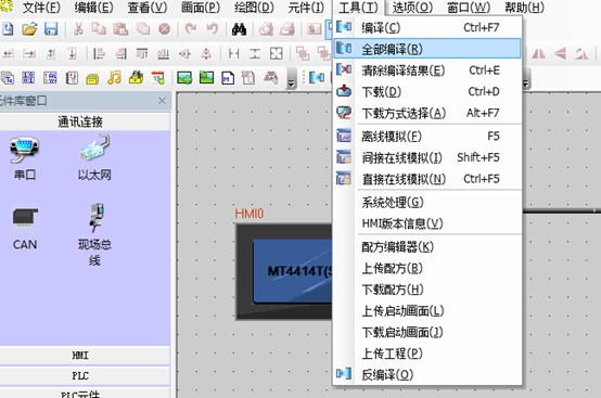 1. 觸摸屏接通電源,軟件內工具菜單點擊“全部編譯”,等待編譯完成