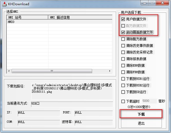 4. 選擇工程下載方式,USB 或者網絡,確認下載,如果提示“通訊失敗”,請檢查下載線連接是否正常(USB線或者網線),再次嘗試。(百度一下速捷工控)
